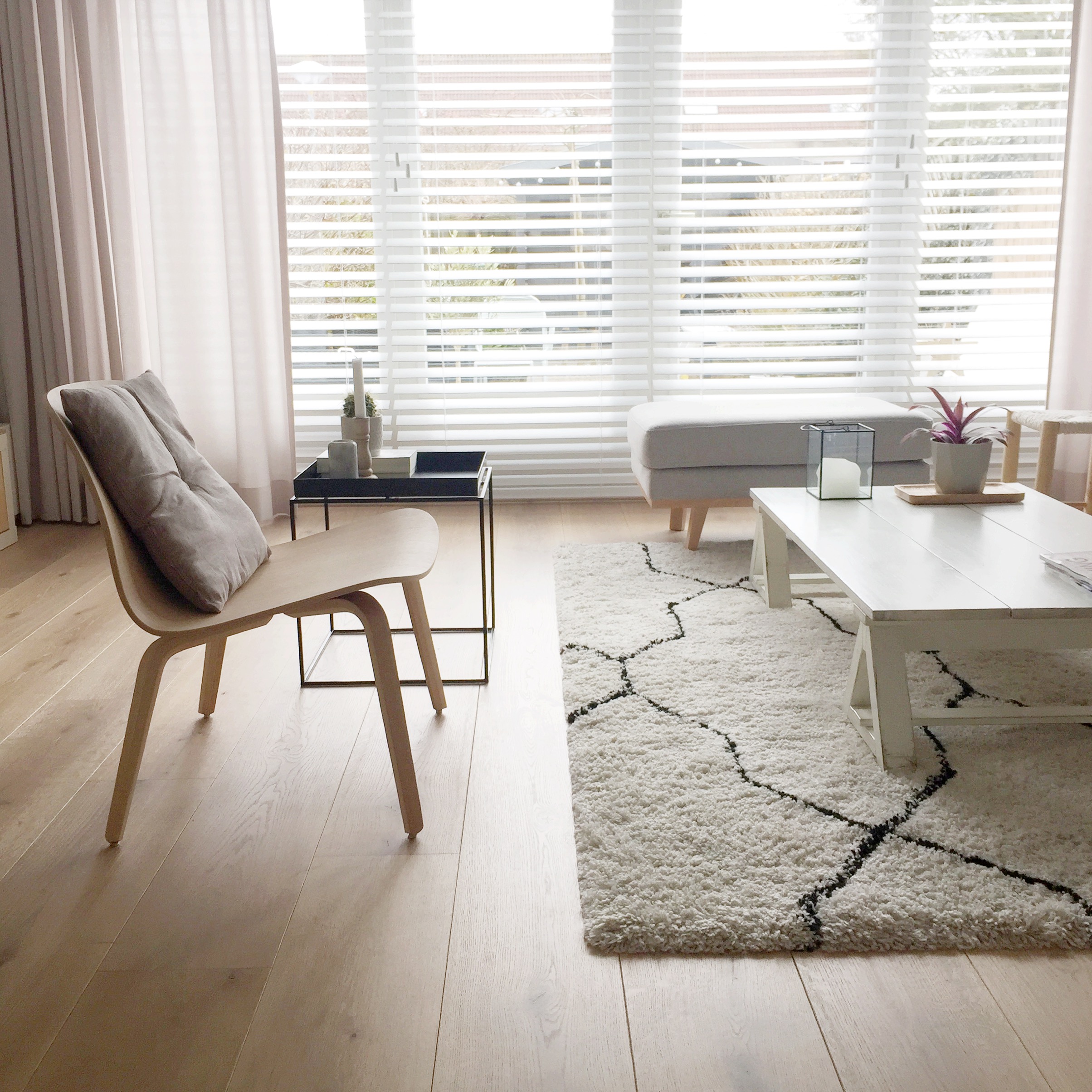 Maar dan, een nieuw meubel ... dat betekent husselen, schuiven en veranderen. Heerlijk om te doen, als je er de tijd voor hebt. Gelukkig had ik van te voren al bedacht waar ik mijn nieuwe designstoel (ongeveer) wilde hebben. De stoel die eerst in de woonkamer stond heeft een plekje op zolder gekregen. Helemaal niet afgedankt, op zolder hebben we een fijne chillplek gemaakt waar deze stoel misschien nog wel beter tot z'n recht komt dan beneden. De nieuwe Visu stoel is lekker laag en loungie. Prettig, want zo kijk je over de stoel heen en oogt de zithoek, ondanks de losse meubels, niet vol en rommelig. De kleur werkt hierbij ook mee, waar ik eerst nog huiverig voor was pakt juist heel goed uit: de stoel gaat op in de ruimte, zonder dat 'ie verdwijnt. Hij lijkt gemaakt voor de houten vloer en vormt een prachtig contrast bij de rest van mijn meubels. Omdat we een 3-zits bank hebben (met een losse hocker erbij) vind ik een stoel in het zitgedeelte echt wat toevoegen. Op dit moment staat 'ie recht tegenover de bank, maar de plek wisselt nogal eens. Gelukkig is 'ie lichtgewicht, dus gemakkelijk te verplaatsen, zelfs voor de kinderen.
